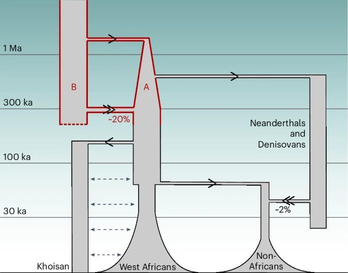 Really cool side note: the analysis also suggests that the population from whom both Neanderthals and Denisovans emerged came only from the majority group. Some of them split in the time before the remixing that gave us us, and slowly migrated out of Africa. They would not meet Homo sapiens for more than half a million years. As soon as they did, genes flowed. And that is why you (if you have European ancestry) carry Neanderthal DNA.